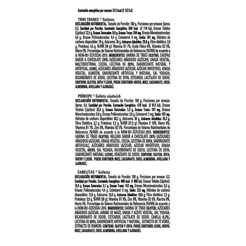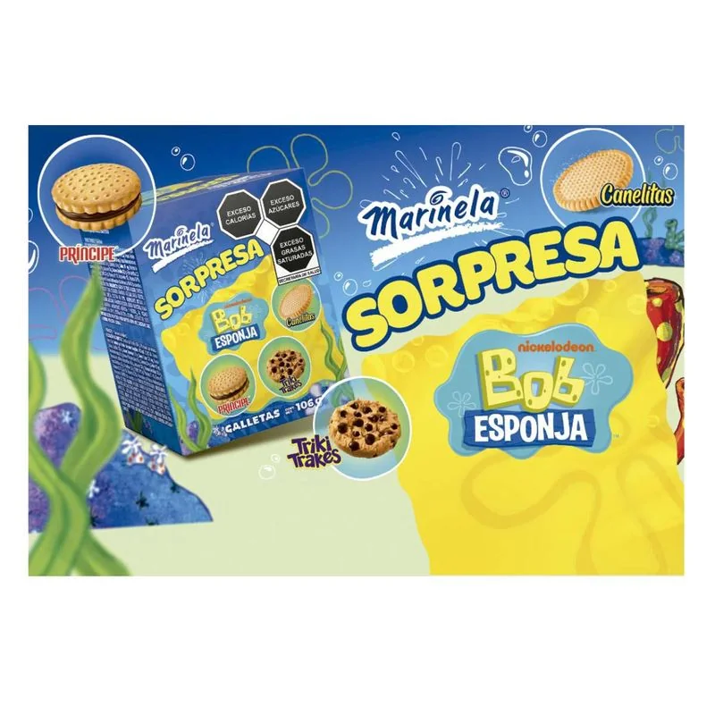 Marinela Surprise is a box with 3 packages of cookies and a surprise from SpongeBob SquarePants. The cookies included are, a package of Principe Marinela 42g (4 cookies), a package of Canelitas Marinela 30g (3 cookies), Triki trakes 34g (4 cookies). They are a good option to share and collect fun exclusive characters.