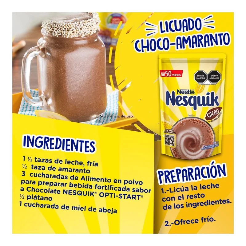 In a glass with skim milk (231ml), add 2 tablespoons (13.8g) of Nesquik chocolate flavor powder.