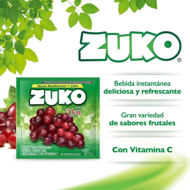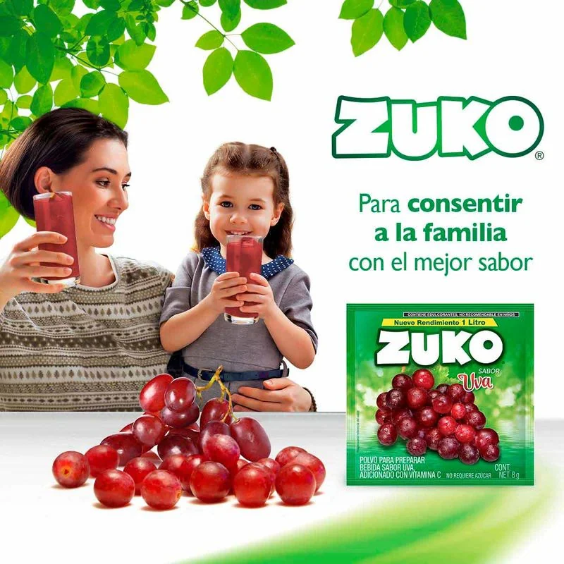 Zuko is the instant drink that helps you provide flavor and variety to your family at all times. Accompany your meals with the incredible flavor of Zuko grape, which is also added with Vitamin C. Each sachet makes 1 Liter.